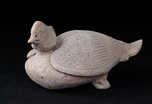 Large grey pottery mandarin duck shaped inkstone carved with the character su, Tang dynasty (618-907)