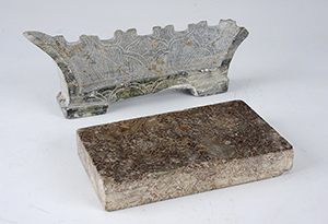 Fish roe stone ink slab of rectangular shape and accompanying she stone basin shaped brush rest with incised design, Tang dynasty (618-907)
